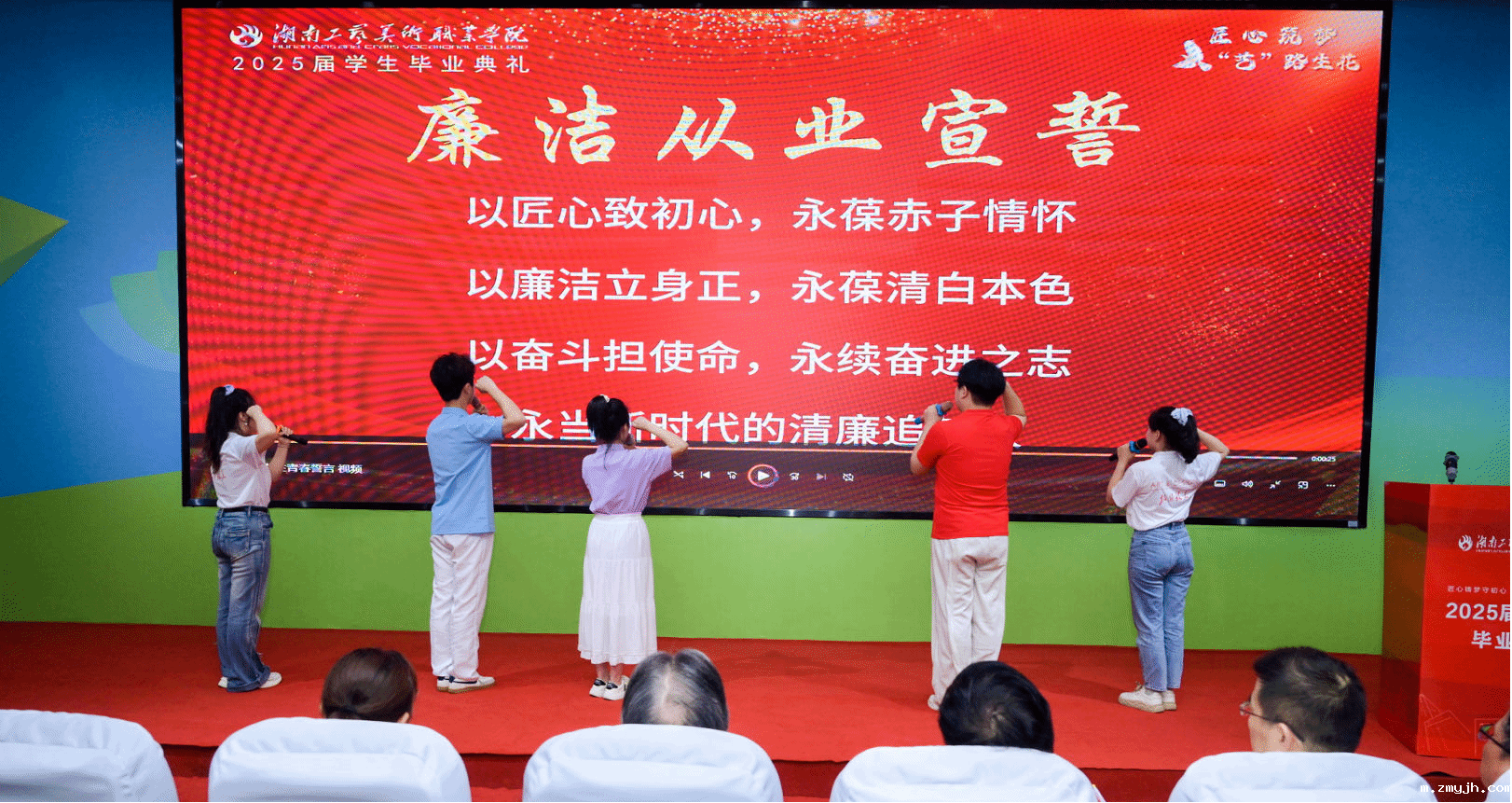 6月19日学校2025届毕业典礼上,全体毕业生右手握拳庄严宣誓:“以匠心致初心,永葆赤子情怀;以廉洁立身正,永葆清白本色……永当新时代的清廉追梦人!”铿锵誓言在报告厅回荡。即将奔赴新疆的“西部计划”志愿者高海峰说:“廉洁从业宣誓仪式让廉洁从抽象的纪律要求,变成了具体的人生信条,无论我走到哪里,都会牢记今日誓言。”